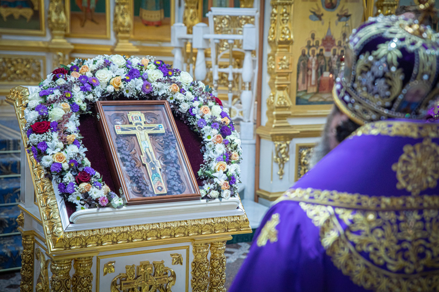 В алтаре кафедрального собора хранится крест с частицей Животворящего Креста Господня. Накануне вечером за всенощным бдением этот крест был вынесен для почитания верующими. В завершение литургии владыка также поклонился перед святыней, после чего обратился к молящимся со словами проповеди.