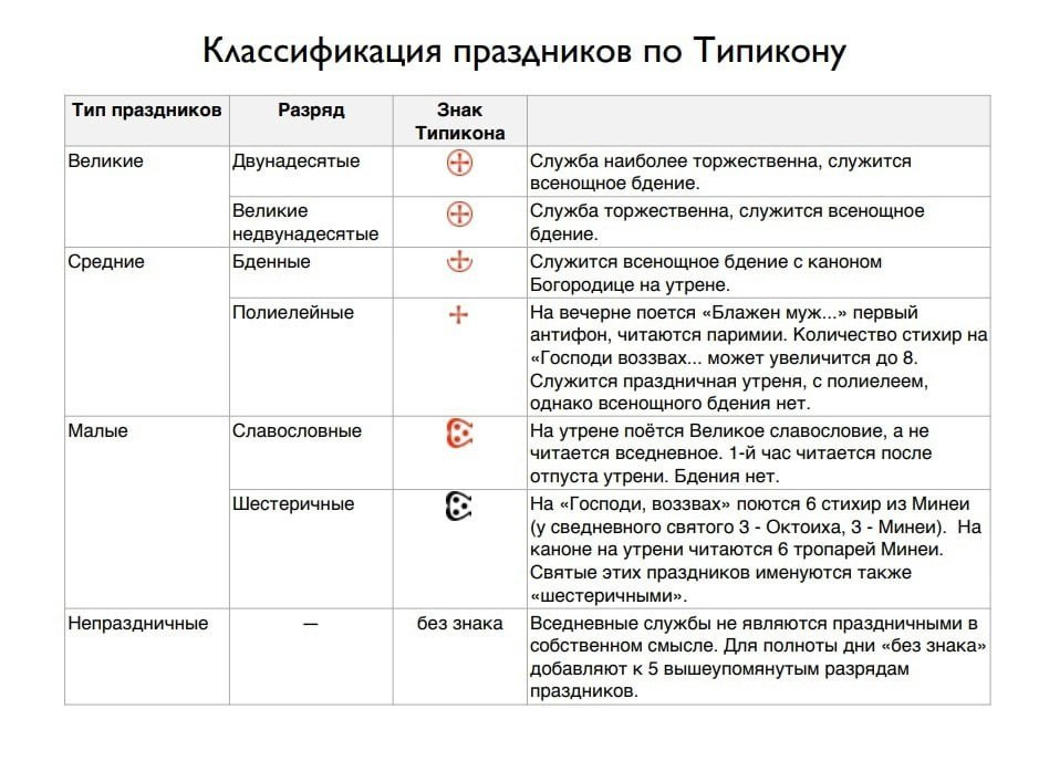 Ну а дальше из них могут формироваться различные комбинации, которые зависят от ранга службы. Ранги, или разряды богослужения имеют следующие названия (см. таблицу на иллюстрации):