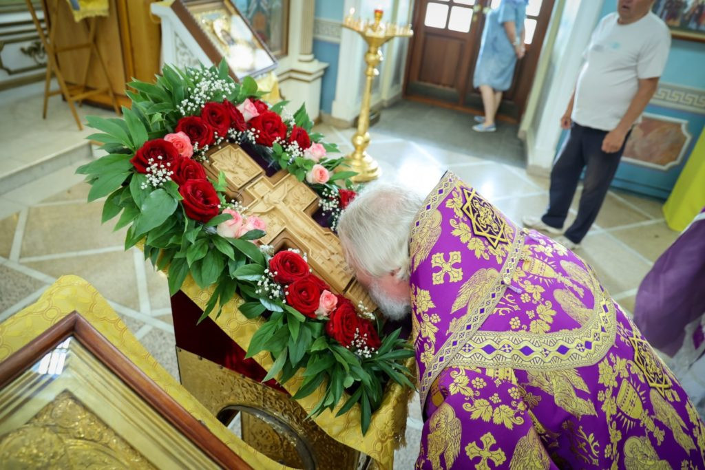 После отпуста правящий архиерей, духовенство и миряне при пении «Кресту Твоему поклоняемся, Владыко…» совершили поклонение Животворящему Кресту Господню, изнесённому накануне на середину храма.