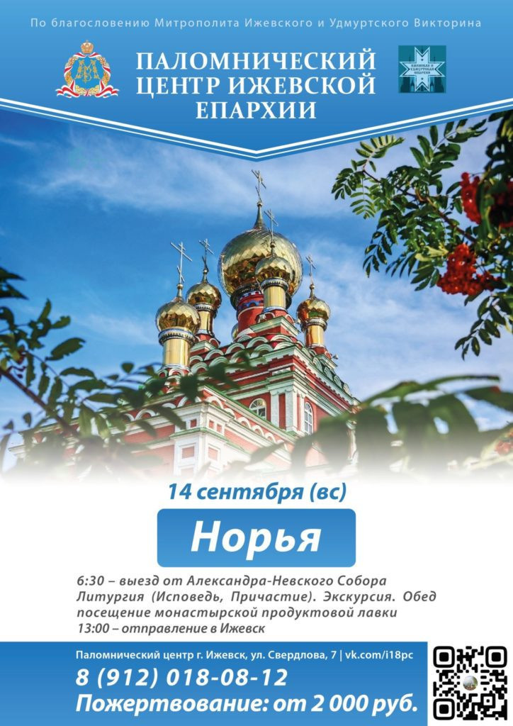 Паломнический центр Ижевской епархии приглашает в Мало-Дивеевский женский монастырь с. Норья 14 сентября