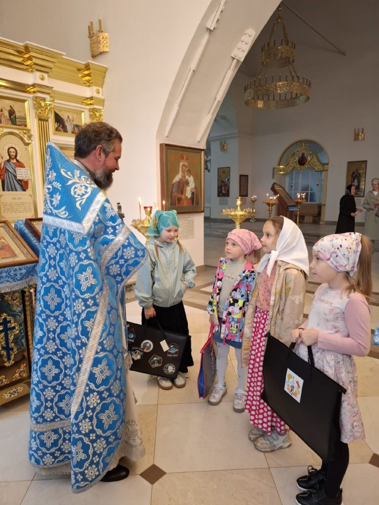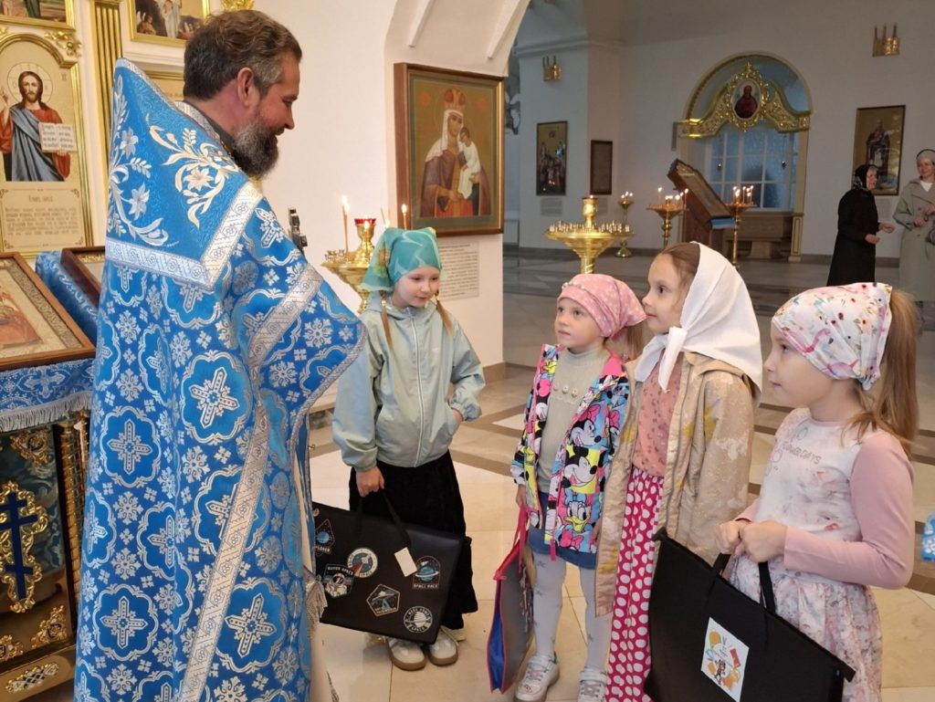 По окончании молебна первоклассникам были вручены сумки со школьными принадлежностями.