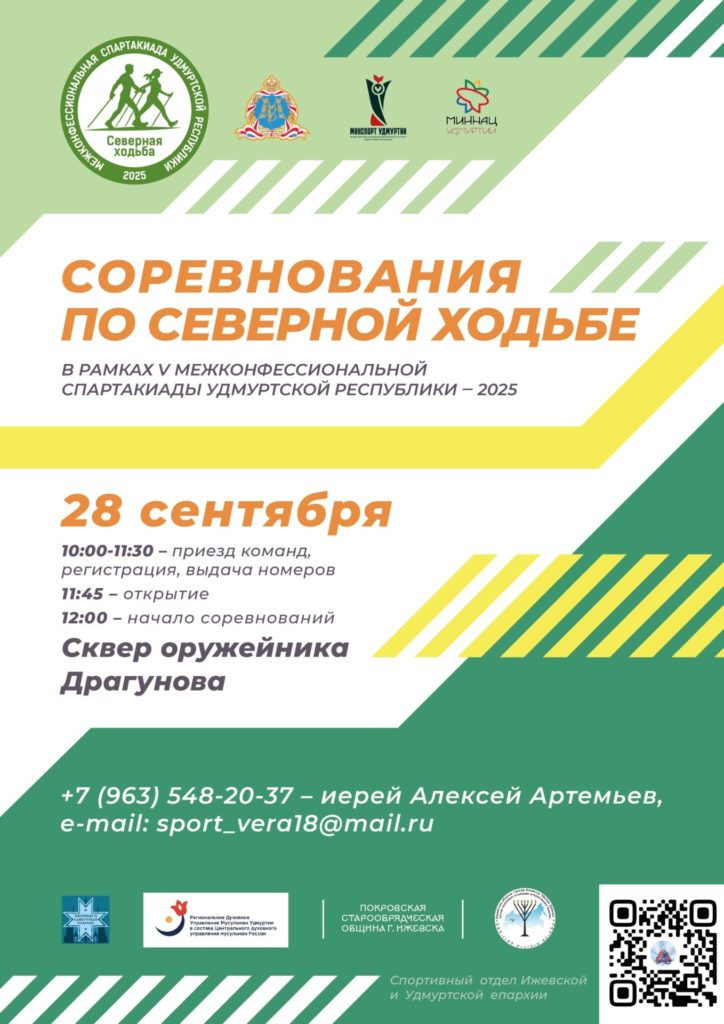 В рамках V Межконфессиональной спартакиады Удмуртии 2025 года 28 сентября предусмотрены соревнования по северной ходьбе. Подробнее можно ознакомиться в Положении