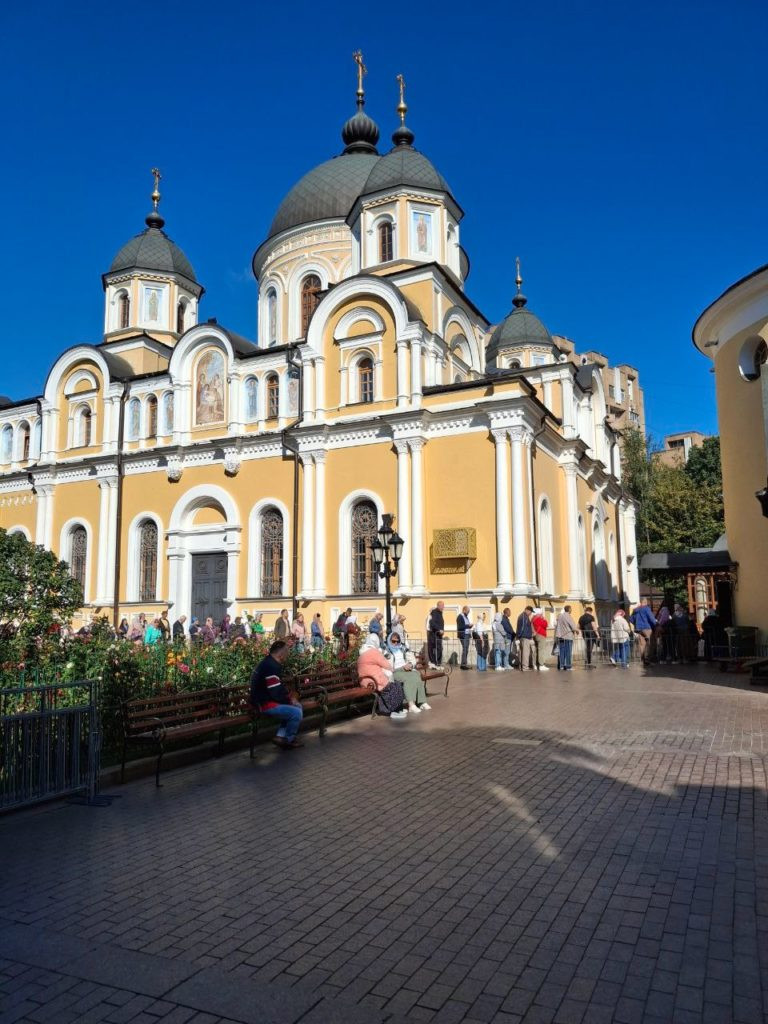 Поездку с самого начала благословила прекрасная солнечная погода. В первый день мы рано утром прибыли в московский Покровский монастырь. Мы поклонились мощам святой блаженной Матроны Московской, помолились на Божественной литургии, а после завтрака нас ждала экскурсия. Огромные очереди и полный храм людей, несущих матушке Матроне цветы, — яркое свидетельство того, что православная вера в нашем народе жива!
