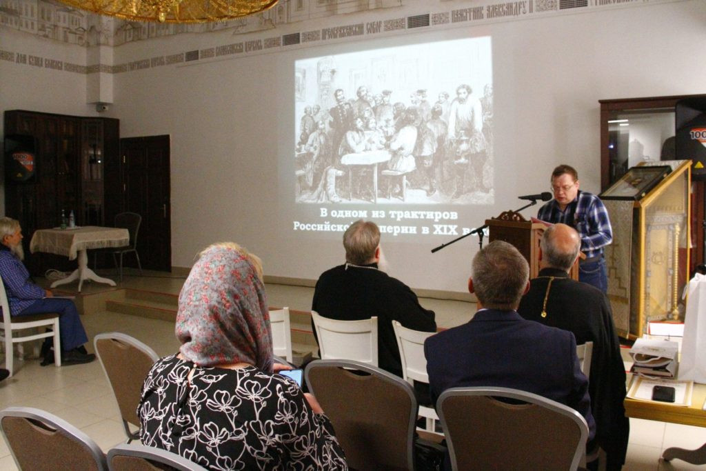 Отец Алексий начал с объяснения причин появления обществ трезвости во второй половине XIX века и дал их общую характеристику. В ходе рассказа о Шарканском обществе трезвости конца XIX — начала XX веков он упомянул его почётных членов, среди которых были миссионеры-священники, крупные благотворители и известные личности: протоиерей Венедикт Раевский, протоиерей Иоанн Трапицын, владелец чугунолитейного завода в Шаркане Алексей Родыгин, священник Аполлоний Мышкин, волостной старшина Касаткин, а также волостные судьи Ларионов и Хохряков. Также священник сказал несколько слов о деятельности нынешнего православного общества трезвости «Возрождение» при храме первоверховных апостолов Петра и Павла и в заключение подчеркнул, что значимость и масштабность современных обществ трезвости могли бы значительно вырасти за счёт личного включения в трезвенную работу губернаторов, руководителей предприятий и районов, пропаганды трезвого образа жизни на их собственном примере, принятия законодательных мер по ограничению продажи алкоголя.