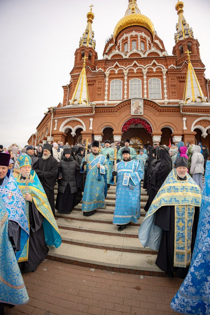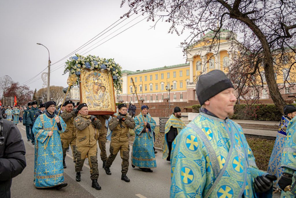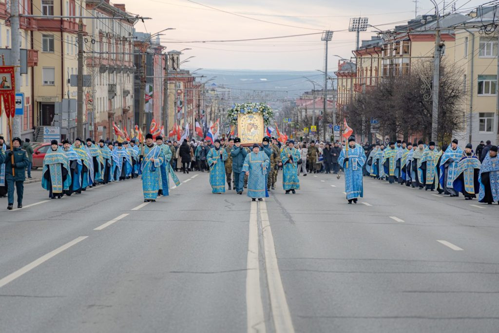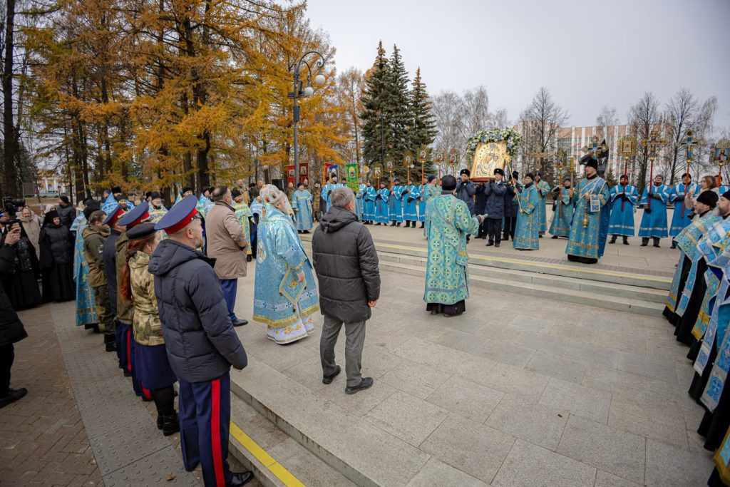После Божественной литургии в Михаило-Архангельском кафедральном соборе православные верующие во главе с митрополитом Викторином и духовенством Ижевской епархии, а также главой МО «Город Ижевск» Дмитрием Чистяковым и министром национальной политики УР Эдуардом Петровым направились в сквер Победы к Вечному огню. Главную святыню, Казанскую икону Божией Матери, торжественно несли сотрудники МЧС России по Удмуртской Республике, сотрудники Управления Федеральной службы судебных приставов по Удмуртской Республике, а также представители казачества.