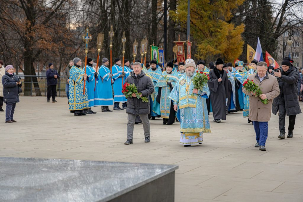 В Сквере Победы был совершён молебен Пресвятой Богородице и лития за всех, положивших жизнь за веру и Отечество – от героев Куликовской битвы и ополченцев 1612 года до наших современников, павших в боях в годы Великой Отечественной войны и в ходе специальной военной операции.