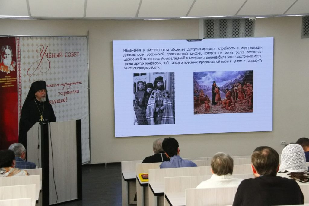 Следующим выступил руководитель отдела религиозного образования и катехизации Глазовской епархии игумен Серафим (Николин). Сообщение отца Серафима было посвящено историографии пастырского и миссионерского служения святителя Тихона (Беллавина), патриарха Московского и всея России, в Северной Америке. Благодаря детальному анализу источников, содержащих достоверные данные о жизни и деятельности святителя Тихона в Америке, священник смог воссоздать значимые страницы истории, связанные с выдающимся церковным деятелем, и подчеркнуть его основные достижения.