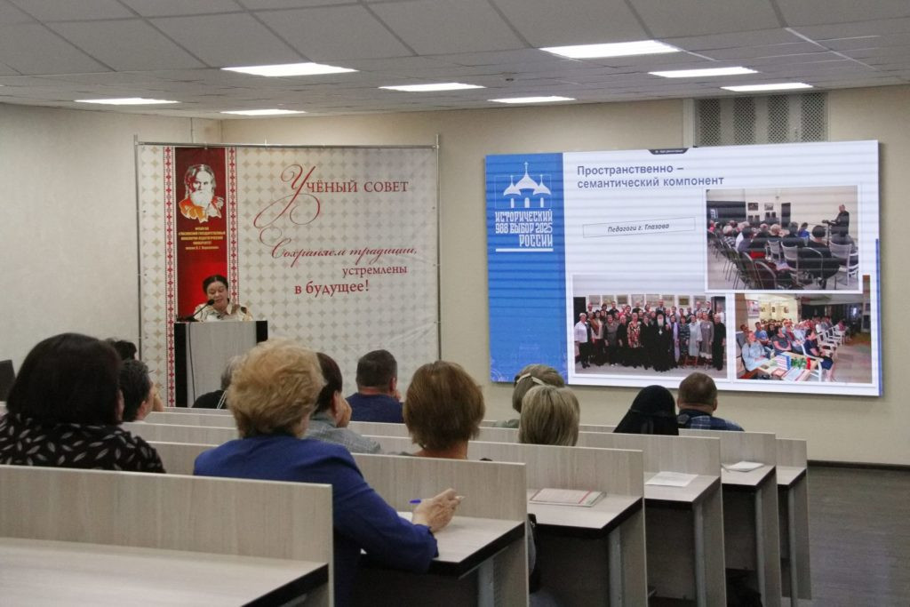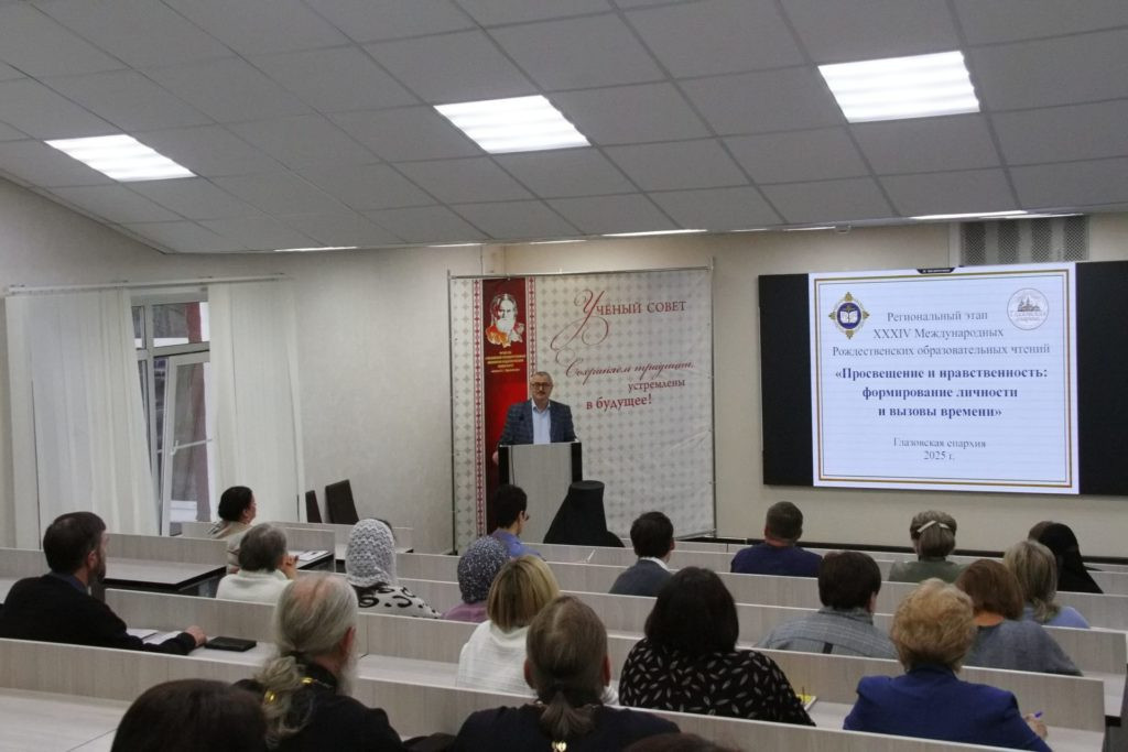 По окончании Божественной литургии в Спасо-Преображенском кафедральном соборе на базе первого корпуса ГИПУ им. В.Г. Короленко прошло пленарное заседание XI Межрегиональной церковно-исторической конференции «Островидовские чтения» в рамках регионального этапа XXXIV Международных Рождественских образовательных чтений на тему: «Просвещение и нравственность: формирование личности и вызовы времени», а в духовно-просветительском центре «Преображенский» работа секций. В пленарном заседании и в работе двух секций «Страницы истории Глазовской епархии и Русской Православной Церкви», «Духовно-нравственное воспитание детей и подростков в современных условиях» активное участие приняли представители государственной власти, научно-педагогического сообщества, духовенство, миряне, преподаватели школ и вузов, краеведы, историки, студенты из Глазова, гости из Москвы, Кирова, Йошкар-Олы, с. Шаркан, – всего около 50 человек.