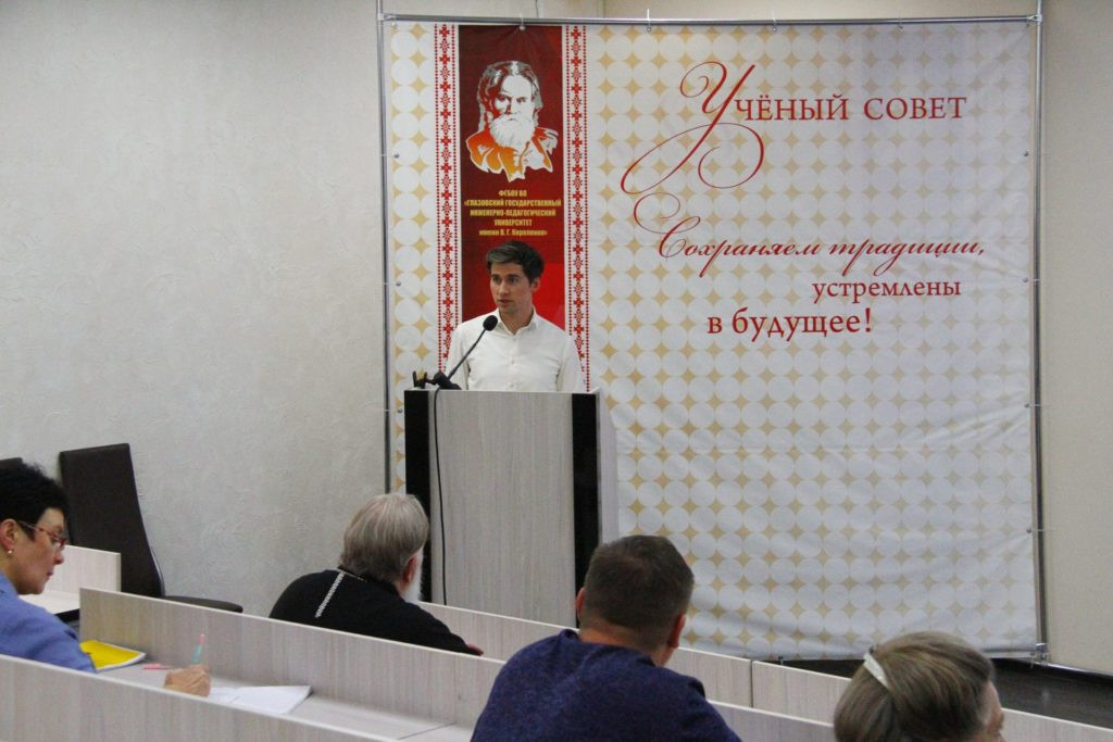 После совместной молитвы «Царю Небесный» собравшихся в аудитории инженерно-педагогического университета поприветствовал руководитель отдела религиозного образования и катехизации Глазовской епархии игумен Серафим (Николин) и предоставил слово проректору по научной и международной деятельности ГИПУ О.Е. Данилову.