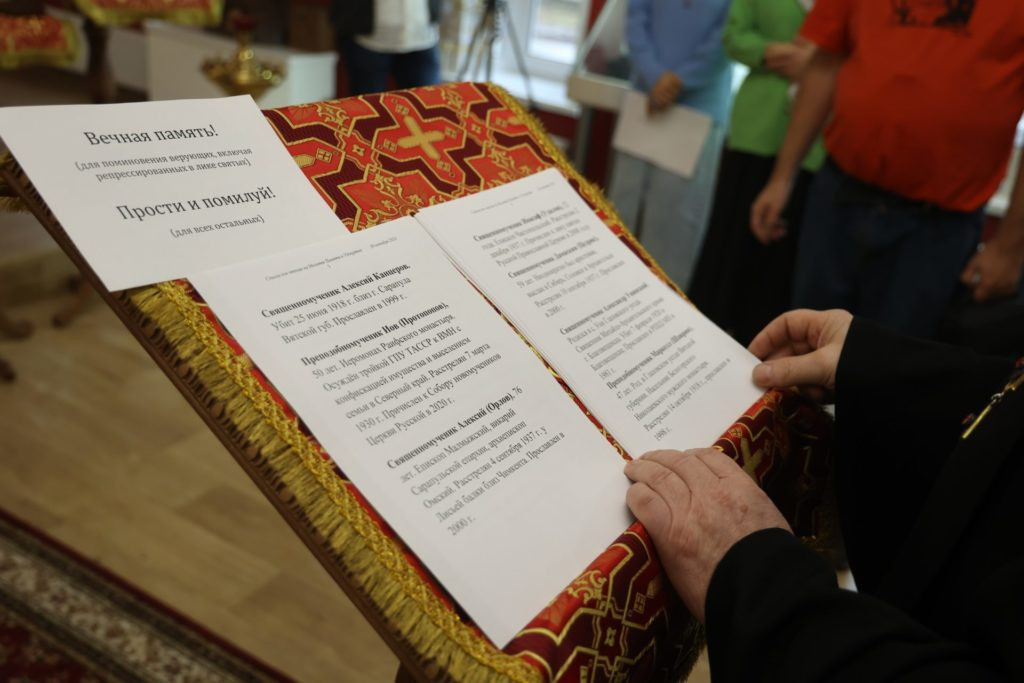 После этого, с 12 до 15 часов, в храме Новомучеников и исповедников Церкви Русской, расположенном в музее, священнослужители сарапульских храмов совершили чин литии. Между богослужениями миряне зачитывали имена репрессированных земляков, вспоминая своих родных, пострадавших от богоборческой власти.