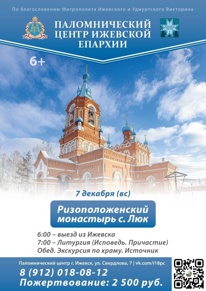 Паломнический центр Ижевской епархии приглашает в поездку в Ризоположенский монастырь с. Люк 7 декабря