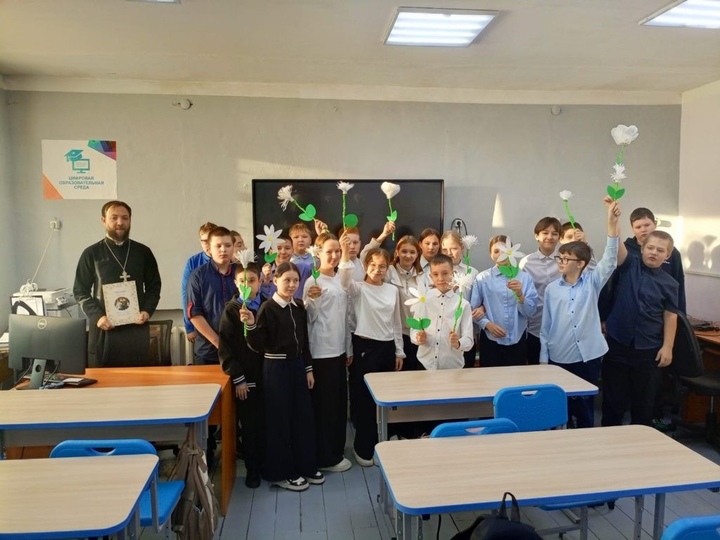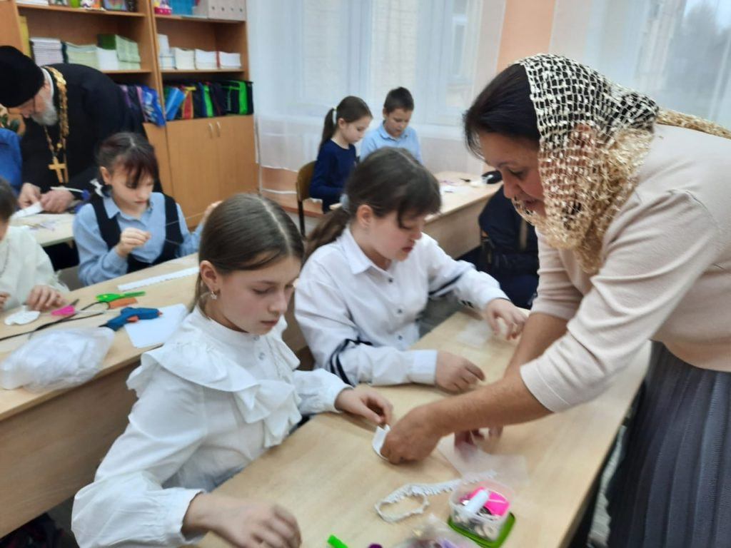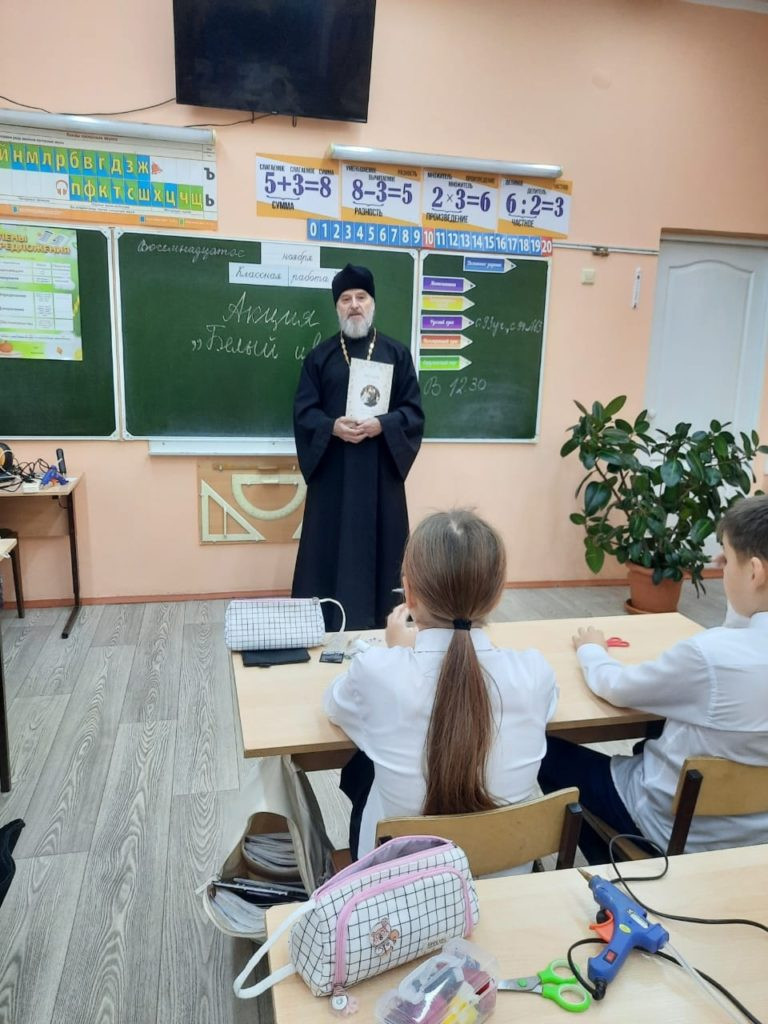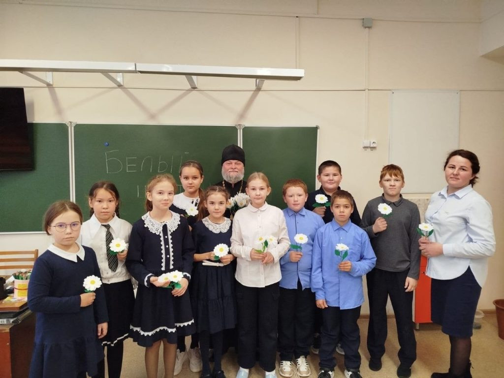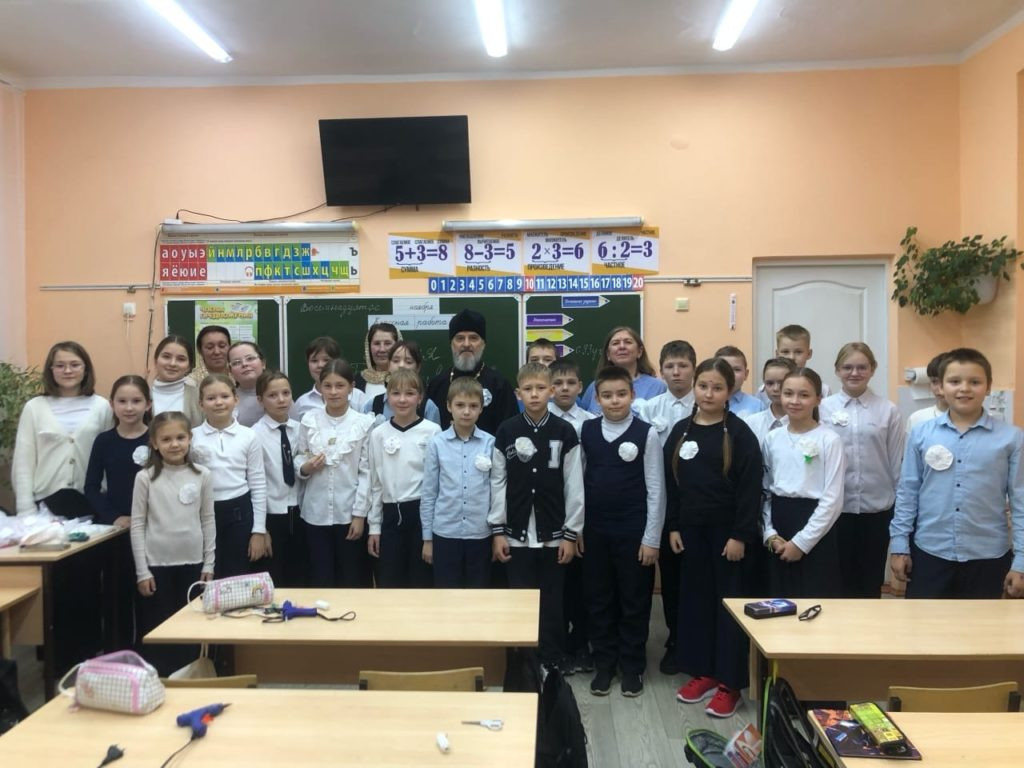 На следующий день, 18 ноября, эстафету принял Лицей №1 им. Н.К. Крупской. Здесь для четвероклассников, изучающих «Основы православной культуры», был проведен открытый урок. Благочинный Закамского округа, настоятель храма Первоверховных апостолов Петра и Павла иерей Георгий Черепанов познакомил детей с историей акции, берущей начало в 1911 году. Затем под руководством учителей и прихожанок Петропавловского храма ребята приступили к творческой части — созданию цветков из белой ткани, вложив в свою работу частичку души, терпение и доброту.
