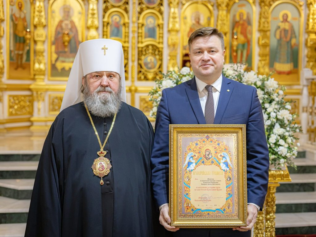 В благодарность Денис Викторович вручил митрополиту Викторину знак Министерства спорта Удмуртской Республики «За вклад в развитие спорта на территории Удмуртии».