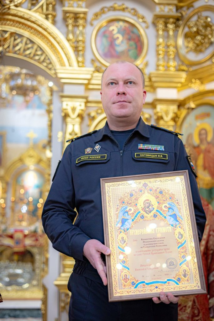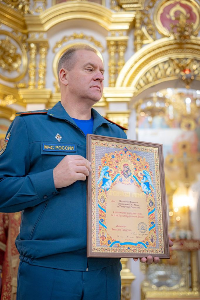 Архиерейские грамоты в благословение за усердные труды во славу Русской Православной Церкви были вручены коллективу Управления Федеральной службы судебных приставов по Удмуртской Республике и коллективу Главного управления МЧС России по Удмуртской Республике.