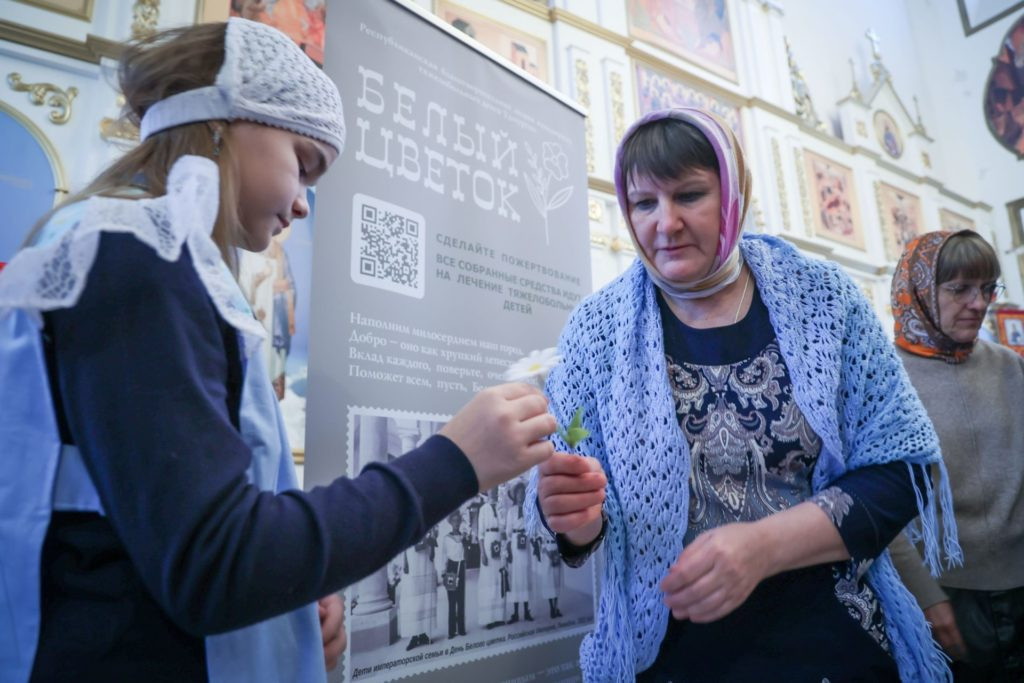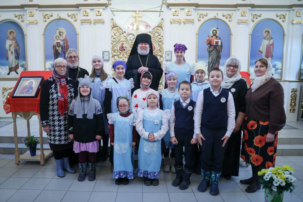 Торжества завершились трогательным выступлением детей из Воскресной группы. Они прочитали стихи, пропели тропарь Архистратигу Михаилу и преподнесли владыке Павлу икону Небесного покровителя храма, изготовленную своими руками. После этого в рамках благотворительной акции «Белый цветок» все желающие могли внести пожертвования на помощь детям-инвалидам, получая в благодарность белые цветы, сделанные руками воспитанников Воскресной группы.