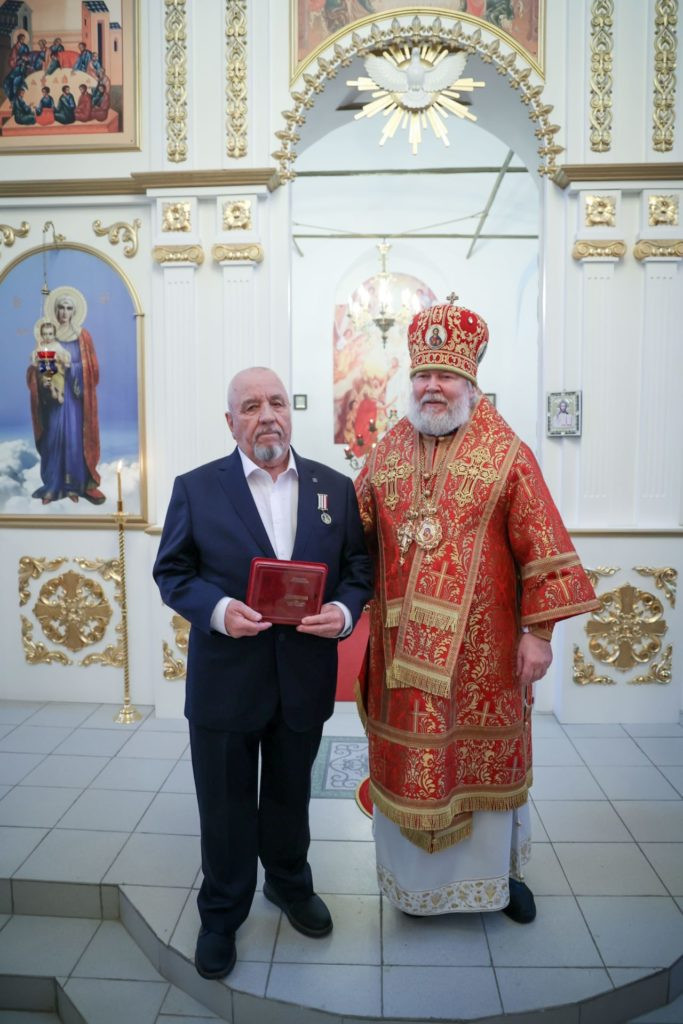 Затем Преосвященнейший владыка вручил епархиальную награду – медаль священномученика Амвросия Сарапульского III степени – благотворителю храма Вячеславу Аркадьевичу Городилову. Вячеслав Аркадьевич, уроженец села Кигбаево, уже много лет проживает в другом регионе, но постоянно и деятельно помогает приходу своей малой родины. Также архиерейскими грамотами и благодарностями за труды были отмечены и другие активные миряне.