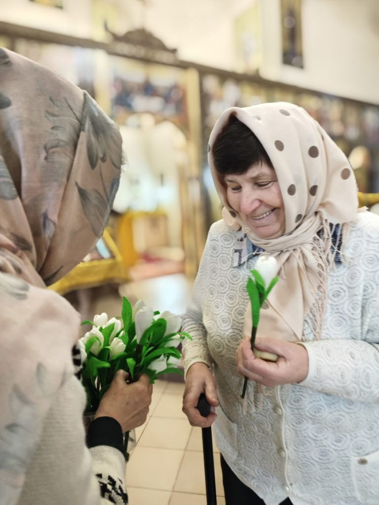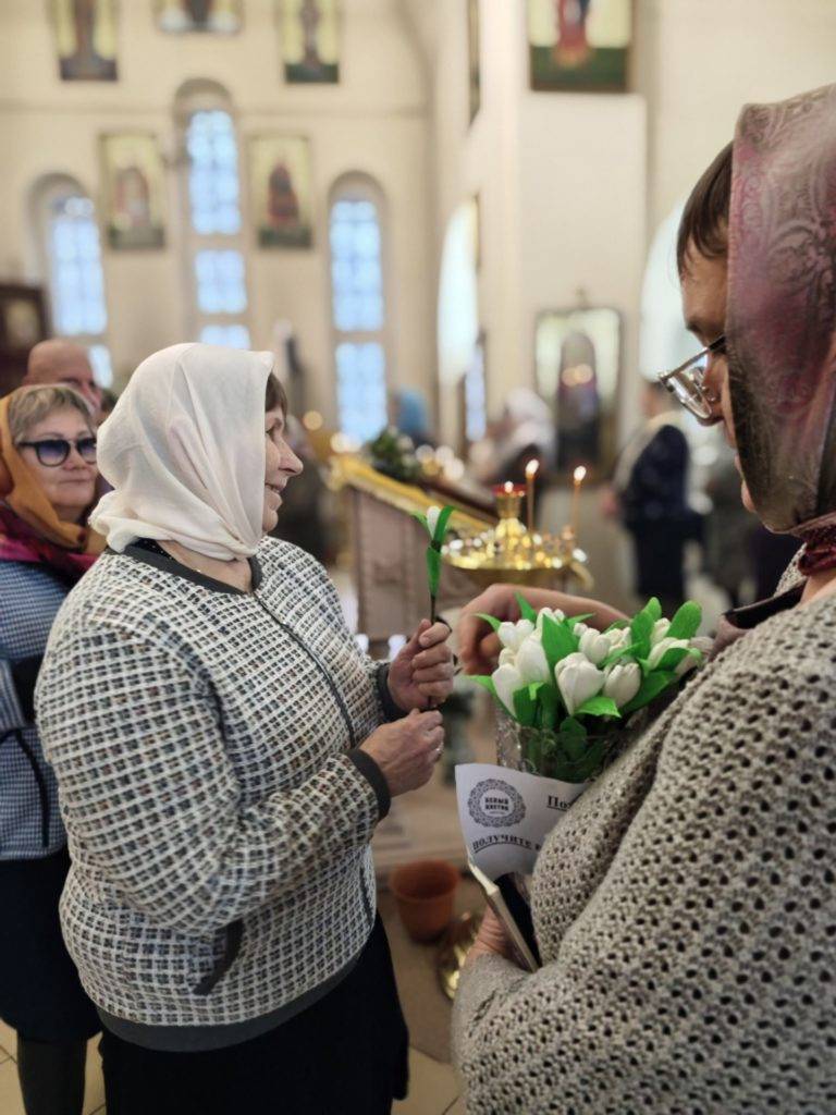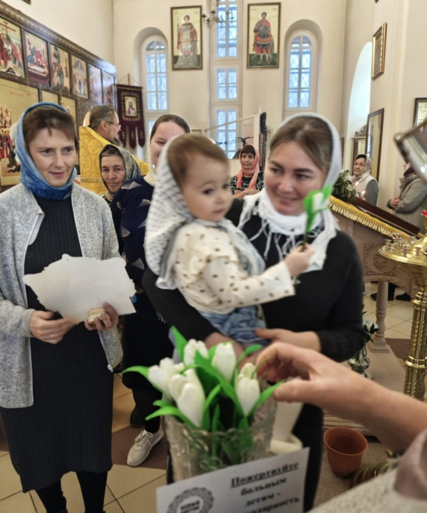 Сегодня вручили белые цветы прихожанам храма в благодарность за их пожертвования на помощь тяжело больным детям.