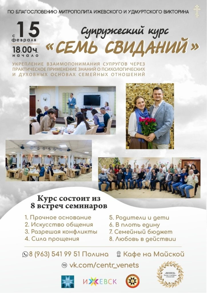 По благословению митрополита Ижевского и Удмуртского Викторина 15 февраля стартует супружеский курс «Семь свиданий», ставший ценным духовным и психологическим ресурсом для укрепления семейных отношений.