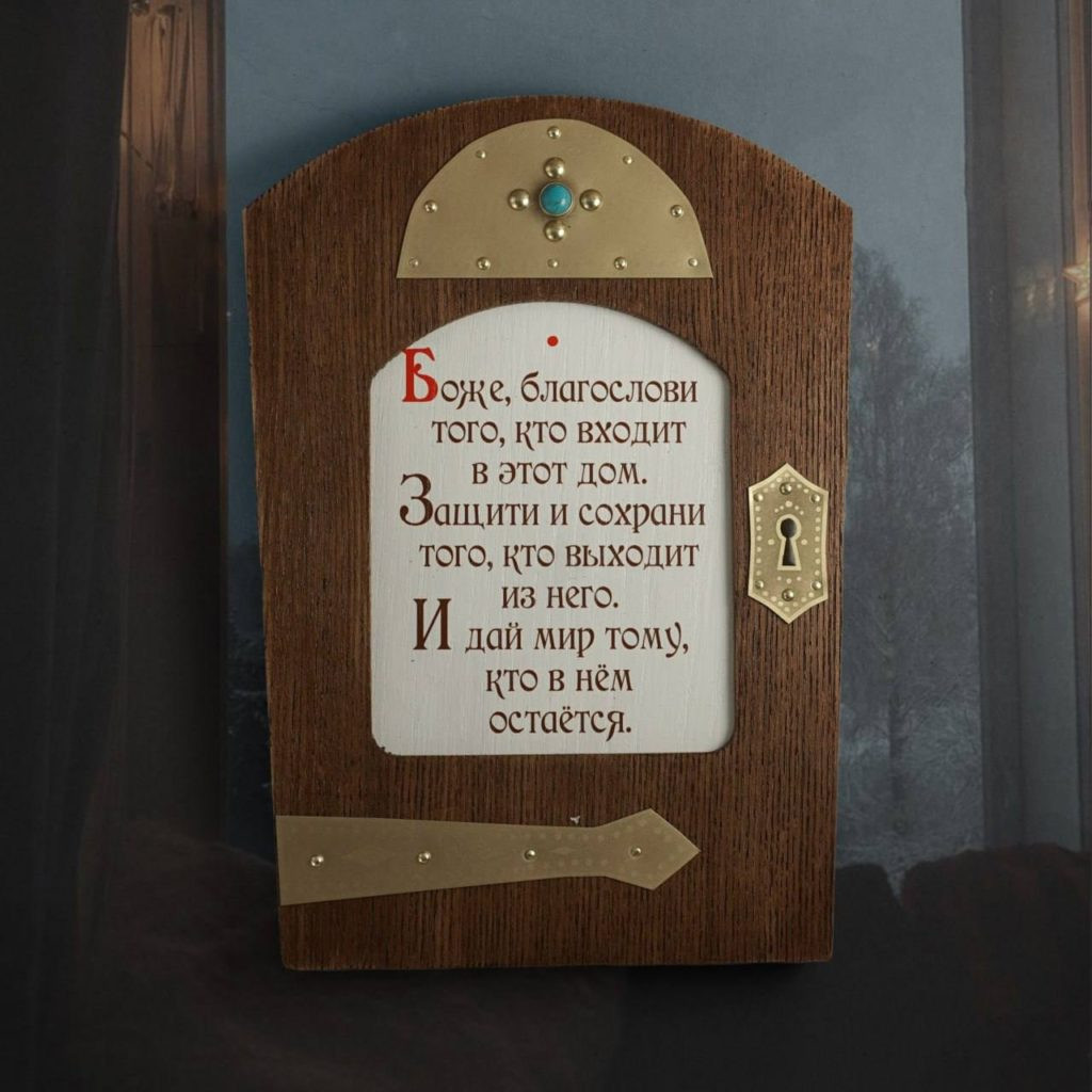 Изящная табличка в виде крепкой и надежной двери со словами молитвы как подарок для любимого дома.