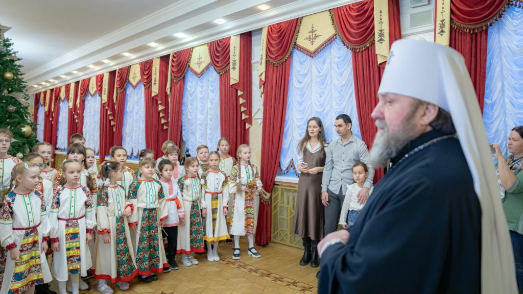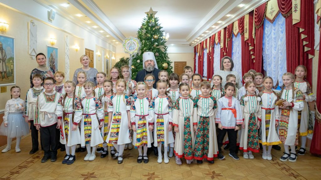 Перед началом представления в фойе театра владыку встретили учащиеся классов с изучением основ православной культуры школы № 93 г. Ижевска. Ребята по традиции исполнили для архипастыря Рождественские колядки, а митрополит успел пообщаться с детьми и пожелать им весёлых каникул.