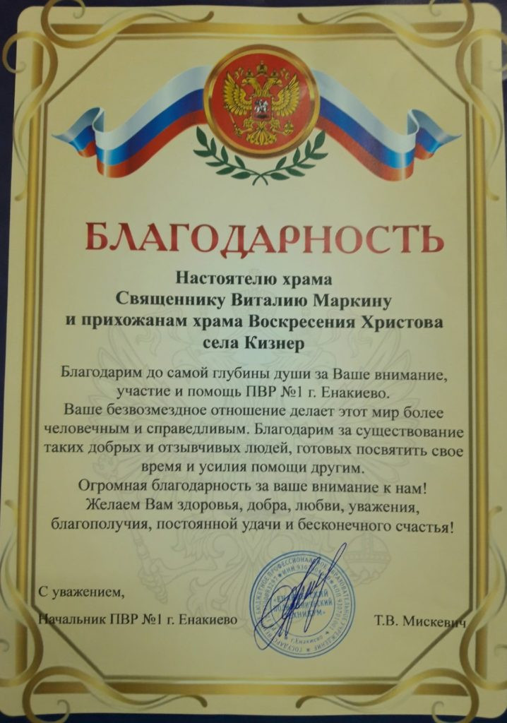 Прихожанам храма Воскресения Христова с. Кизнер вручили благодарность из Пункта временного размещения г. Енакиево ДНР