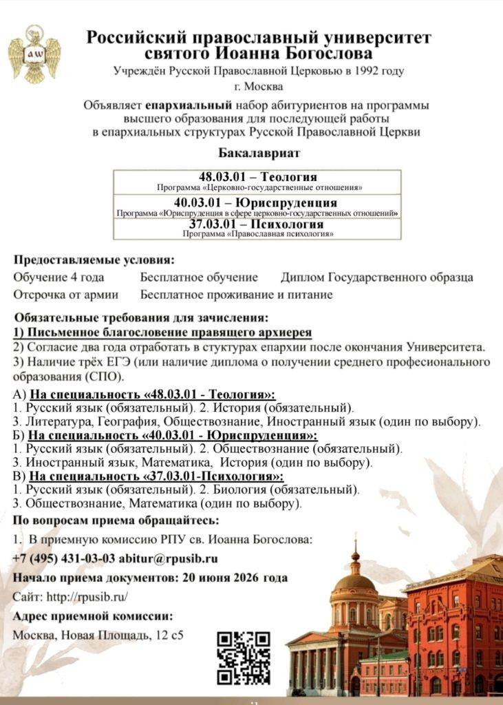Б) На программу «Юриспруденция в сфере церковно-государственных отношений»: 1. Русский язык (обязательный); 2. Обществознание (обязательный); 3. История, иностранный язык, математика (профильная) – (один по выбору).