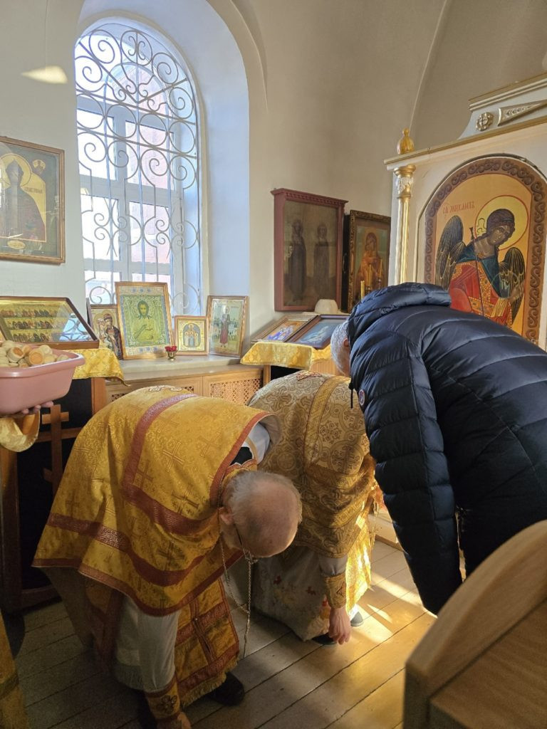 Завершилась служба Чином прощения. Прихожане благоговейно подходили к священнослужителям, прикладываясь к Кресту и святым образам, а затем, смиренно склоняясь, испрашивали прощения друг у друга.
