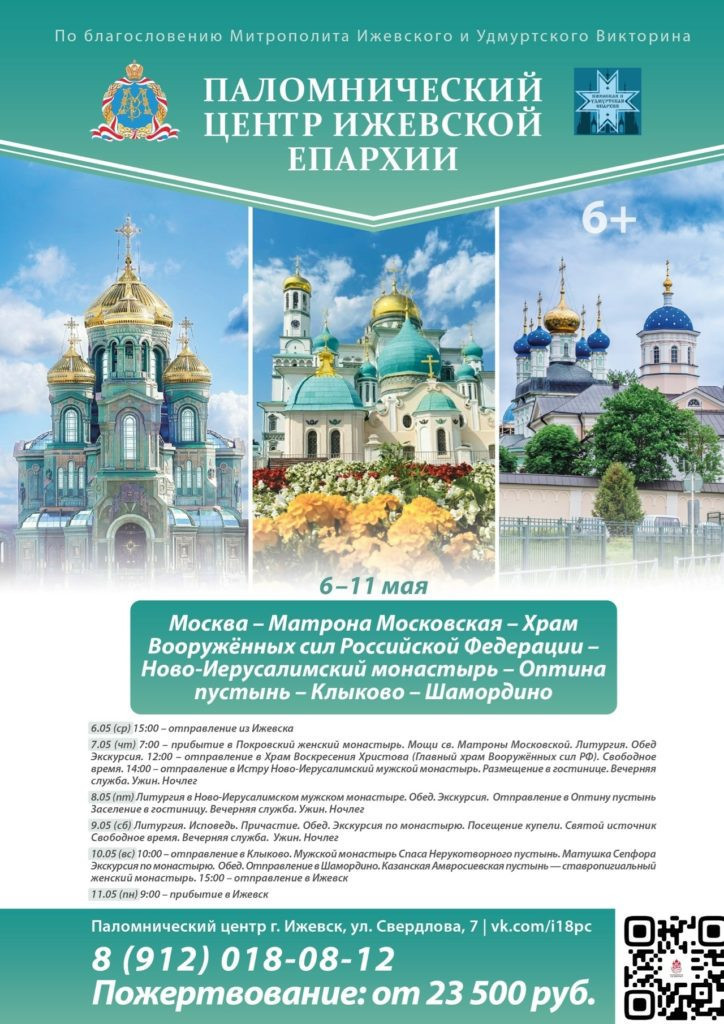 6 — 11 мая: Москва (Матрона Московская, Храм Вооруженных сил РФ) — Ново-Иерусалимский монастырь — Оптина пустынь — Клыково — Шамордино