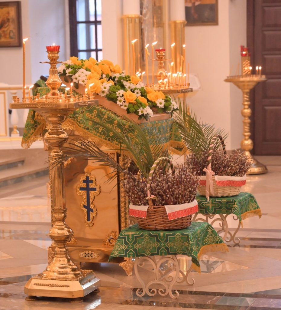 Накануне, во время вечерни была совершена праздничная лития с освящением пяти хлебов, пшеницы, вина и елея. После чтения Святого Евангелия настоятель прочитал молитву на благословение ваий, окропил вербы и пальмовые ветви святой водой, после чего было совершено елеопомазание, к которому приступили все молившиеся.