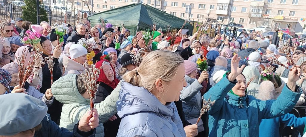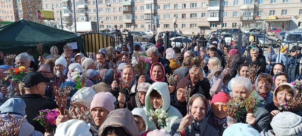 Храм Алексия Московского. В руках прихожан — пушистые веточки вербы