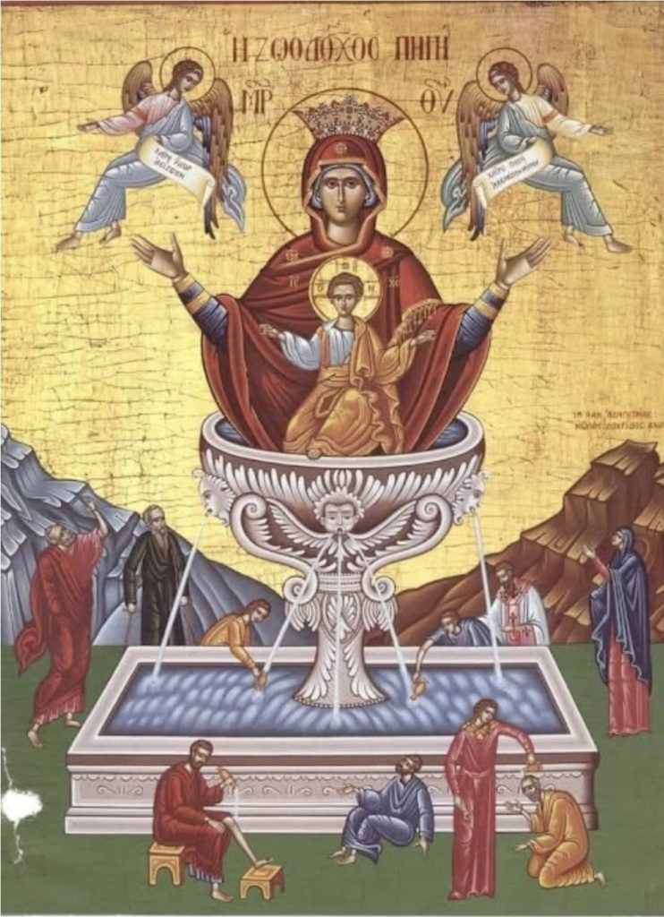 Праздник установлен в память о чуде, произошедшем в V веке близ Константинополя. Воин Лев Маркелл (будущий император) встретил слепца, тщетно искавшего воду. Ему явилась Сама Богородица и указала место источника. Воин напоил слепца и омыл ему глаза — и тот прозрел. Впоследствии император Лев I построил над этим источником величественный храм, названный «Живоносный Источник». К сожалению, после падения Константинополя в 1453 году храм был разрушен, источник засыпан, а древняя икона утрачена. Однако сохранились многочисленные чудотворные списки образа, которые бережно хранятся в Греции, на Афоне и в России.