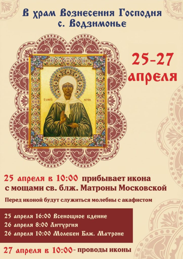 В воскресное утро 26 апреля 2026 года храм Вознесения Господня села Водзимонье был особенно наполнен женщинами. Прихожанки собрались на общую молитву у святого образа блаженной Матроны Московской, который прибыл в храм как раз накануне праздника святых жён-мироносиц.